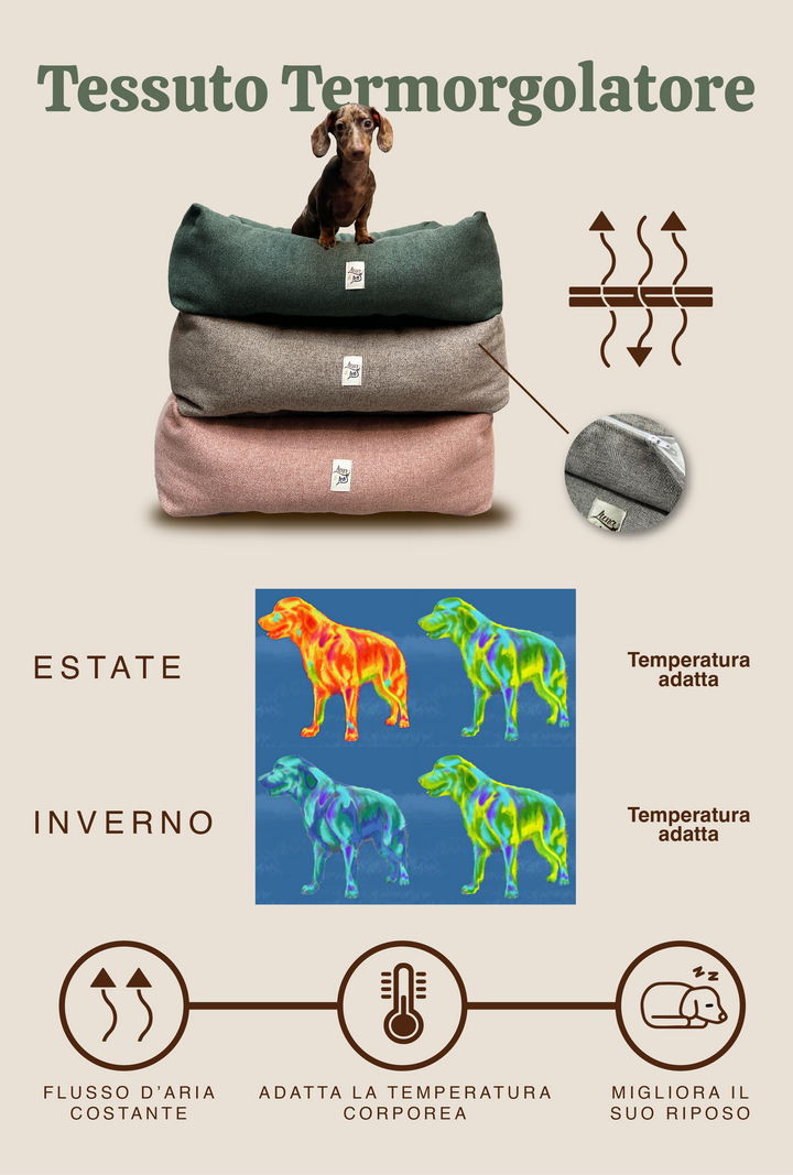 Con il tessuto termoregolatore Mattias, il tuo cane non dovrà più cambiare posto mille volte per trovare sollievo: finalmente un riposo costante, sereno e naturale, in ogni stagione.